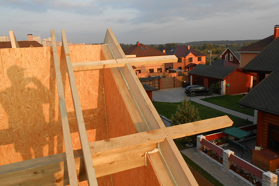 - Далее выполняется обшивка каркаса сайдингом. Для более успешного проведения монтажа на стропильных ногах делаются спилы. Важным условием является параллельность спилов и стен здания. Нижние части стропил пилятся вертикально: так, чтобы они тоже могли быть скрыты обшивкой. Подбирать сайдинг нужно исходя из практичности, долговечности и внешнего соответствия общему стилю строения.