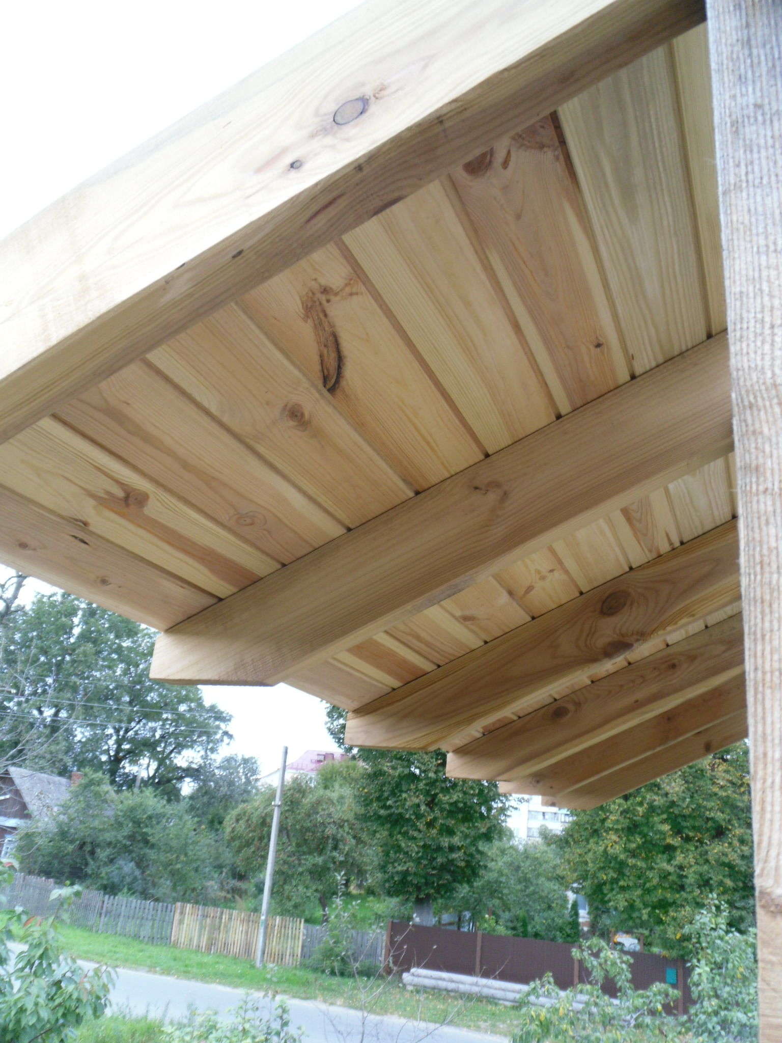 Обшивка карнизов сайдингом из дерева. На фото вид снизу.