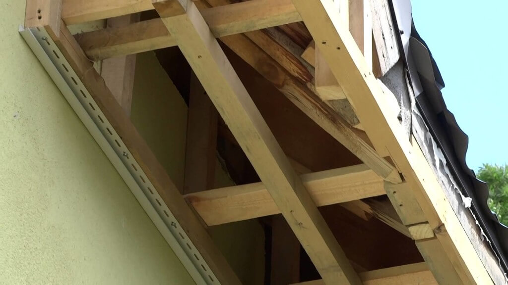 - Более трудоемкий вариант – подшивка бруса от стропила: один конец доски закрепляется на окончании свеса крыши, а другой примыкает к стене. Сложность заключается в выравнивании всех деталей между собой.