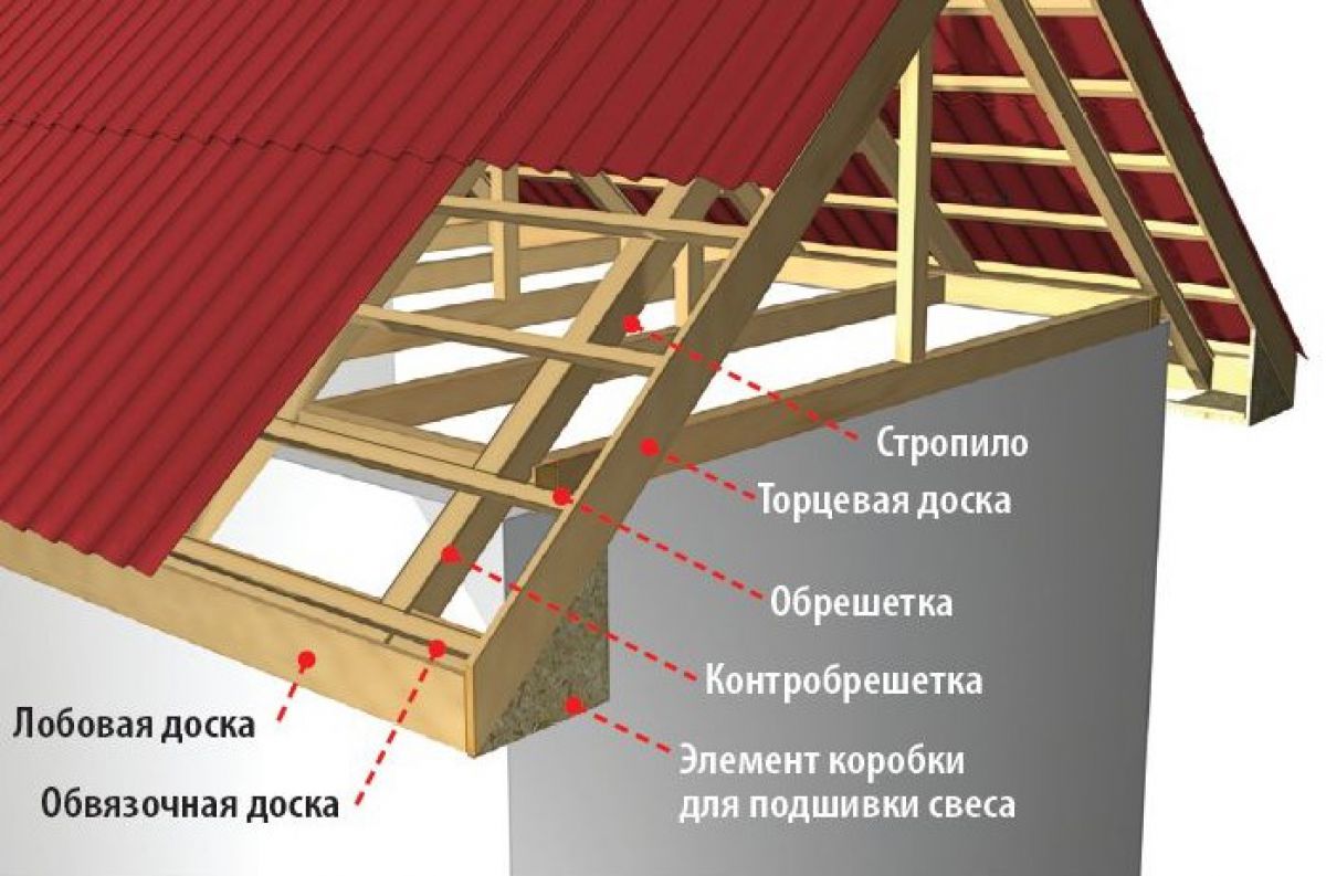 Устройство карниза двухскатной и более сложной крыши предполагает использование стропильной системы и уклона кровли, устойчивость в вертикальной и ветровой нагрузке. Именно последний фактор, если не нейтрализуется, то существенно нивелируется подшивкой свесов крыши. Когда навес закрыт снизу, то вероятность поднятия кровли сильным порывом ветра ощутимо уменьшается.