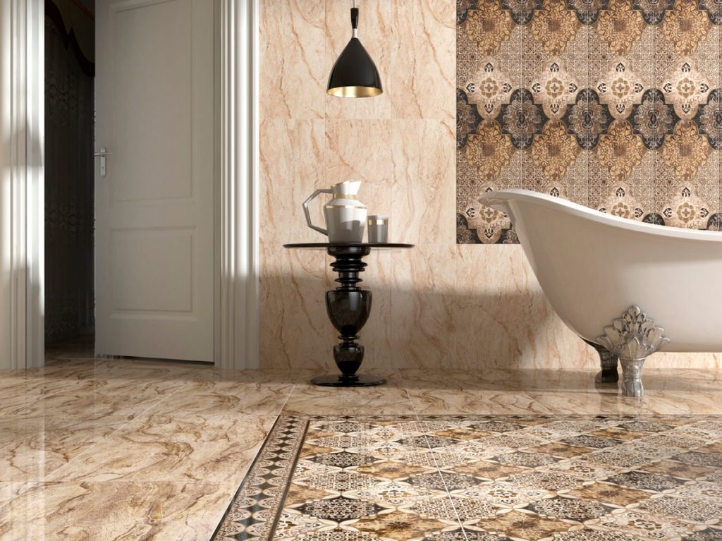 Другим, если не более популярным случаем, когда используется отделка керамической плиткой, является облицовка полов. При таком применении кафеля справедливо всё, что ранее сказано про отделку стен, но есть и свои особенности, касающихся именно отделки пола.