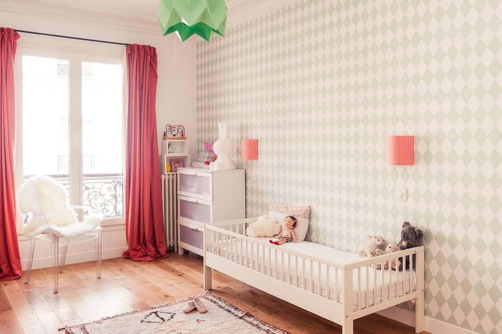 С помощью рисунка на обоях можно скорректировать размеры комнаты, сделать последнюю более уютной. В частности, вертикальный контрастный орнамент приподнимет потолок, а горизонтальный, наоборот, опустит, что может пригодиться в помещении с большой высотой, в котором малышка будет чувствовать себя неуютно.
