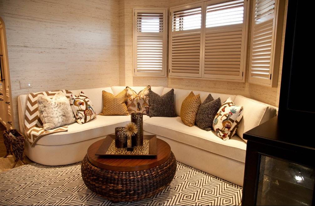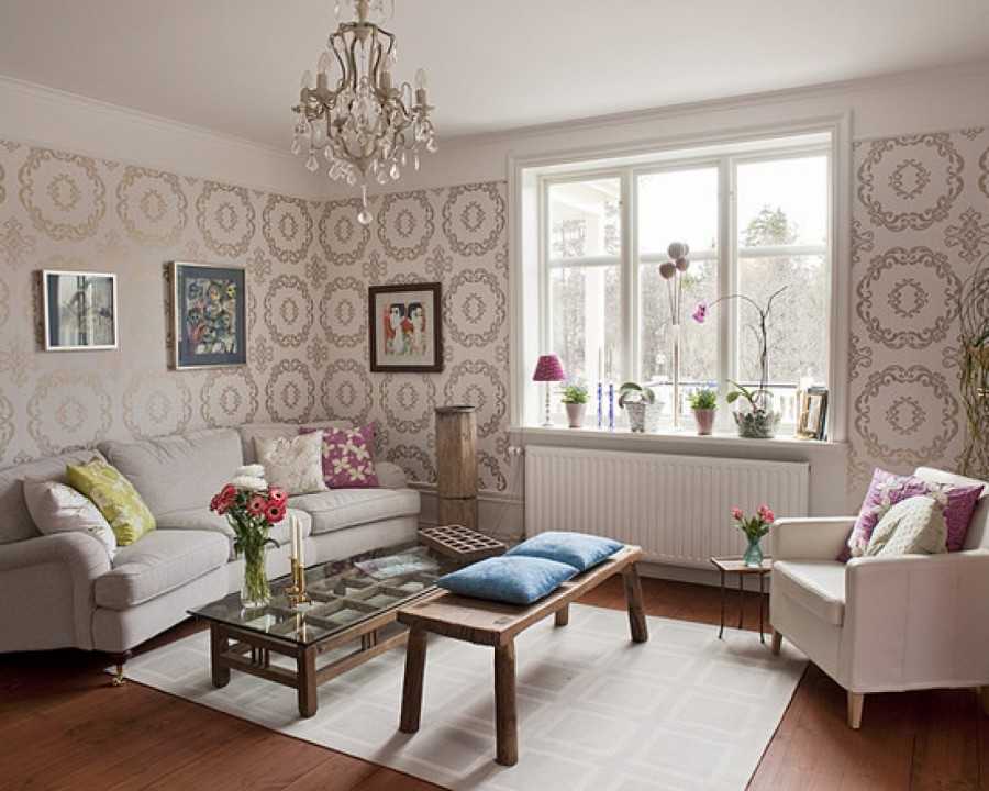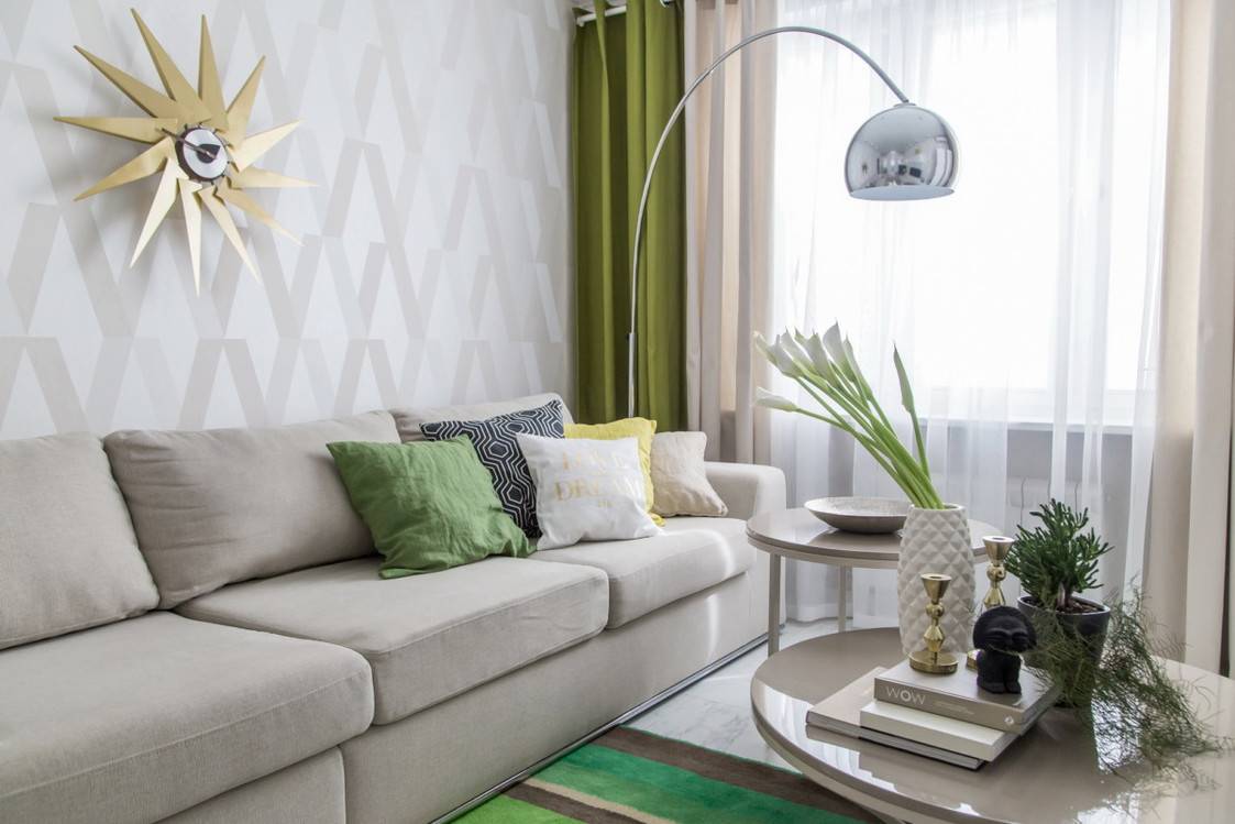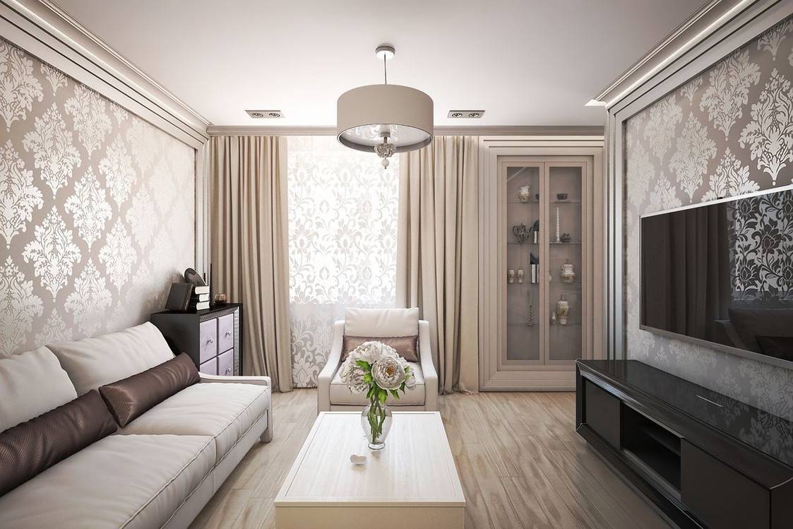 Говорят, что в малогабаритных помещениях нельзя использовать крупные принты в отделке. Но с этим можно поспорить. Здесь дело не в размере орнамента, а в его активности и колоритности. Нейтральные тона на полотнах с крупным, но малоконтрастным узором имеют полное право смело заявить о себе в интерьере маленькой гостиной.