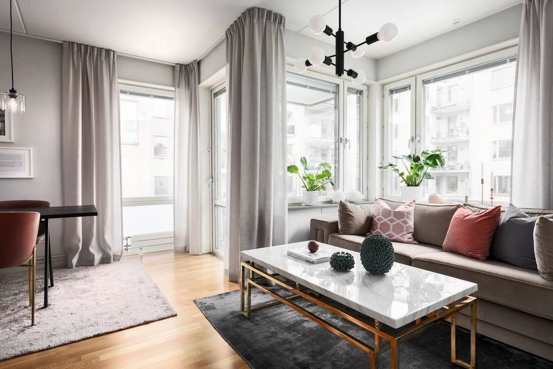 Помните правило трёх: при оформлении пространства никогда не используйте больше трех цветов, чтобы интерьер не смотрелся безвкусно. Поэкспериментируйте, поиграйте на контрастах. Но постарайтесь сильно не увлекаться, чтобы переборщить с красками. Для гостиной с малой площадью подбирайте светлый цвет, поскольку темный цвет визуально уменьшает пространство.