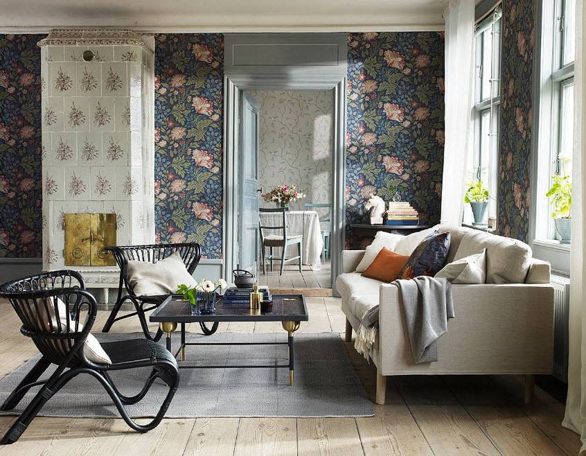 Здесь лишь важно подобрать подходящие для стиля узоры. Если выбирать насыщенные рисунки, стоит задуматься о комбинировании покрытий в отделке одной комнаты