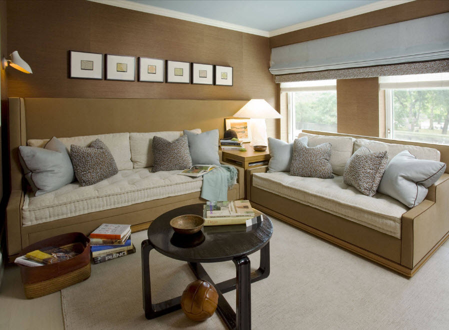 Коричневые обои. Некоторые думают, что такой цвет обоев будет скучен, но это не так. Главное условие будет правильно скомбинировать с другими цветами. Идеальным вариантом дизайнеры отмечают сочетание коричневого и белого цветов. Такой интерьер можно разбавить яркими аксессуарами в виде лампы или же картины. Вообще, все коричневые оттенки способны создать мягкую расслабляющуюся обстановку.
