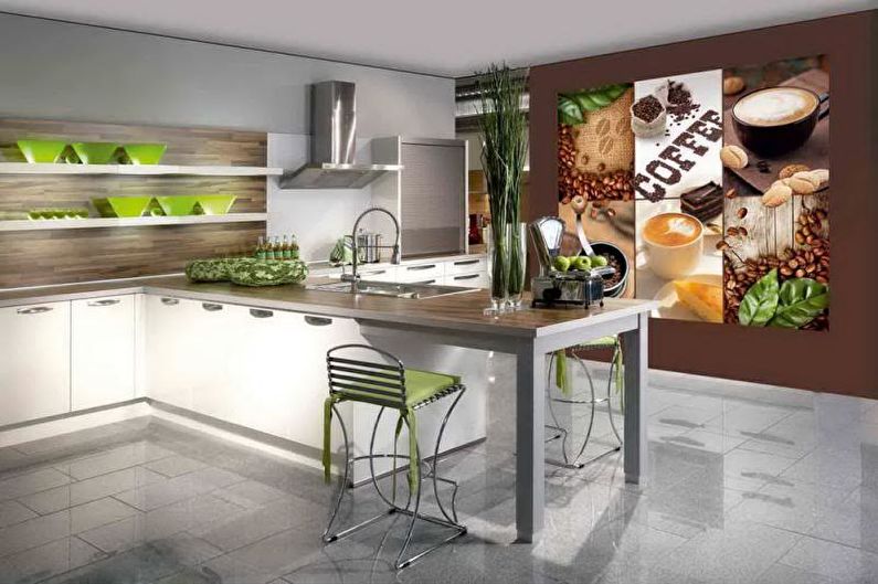 Например: ваша кухня выполнена в стиле прованс. Оклейте глухую стену проективными обоями с лавандовым принтом, и добавьте немного этих же мотивов в интерьер. Не нужно использовать цветастые рисунки на других стенах или рябящий текстиль. В противном случае такой дизайн скоро наскучит вам и будет попросту раздражать.