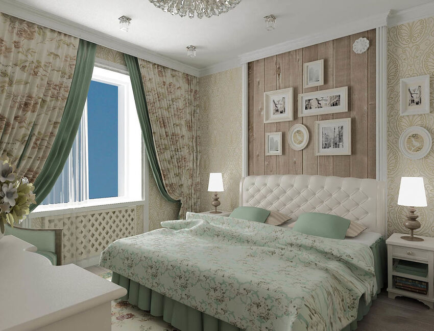 Этот стиль характеризуется легкостью и тягой к естественности, благодаря чему цвет травы отлично впишется в дизайн спальни.