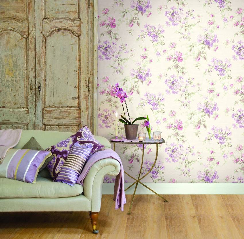Еще одним подходящим орнаментом прованской тематики являются обои в цветочек. Маленькие мотивы в виде букетиков, виньеток или отдельных цветов воспроизведены на холсте в хаотическом порядке. Исключение составляют геометрические фигуры. Совершенно не вписываются в прованский мотив обои с экзотическими птицами, крупными маками, насыщенными бордовыми розами, яркими абстрактными рисунками, городскими мотивами и парадной вязью крупных орнаментов.