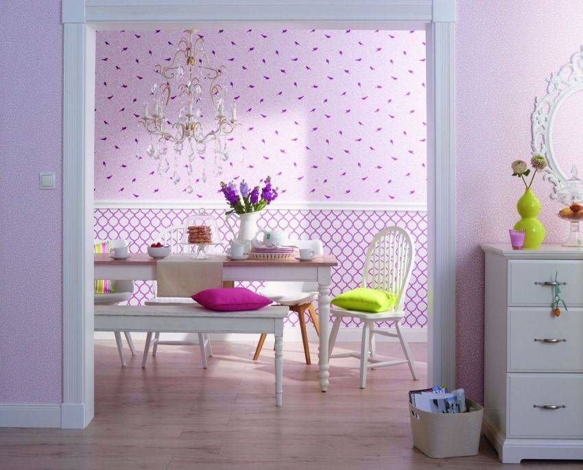 Хорошим решением является гармоничное использование контрастных оттенков, что позволяет разделить комнату на тематические зоны. Это наглядно демонстрируют фото обоев в интерьере прованс.