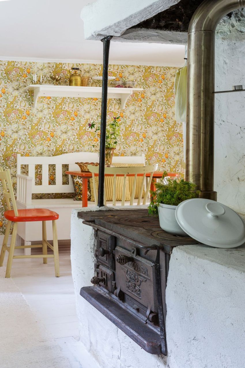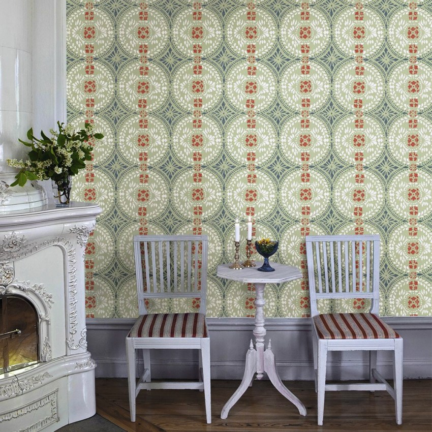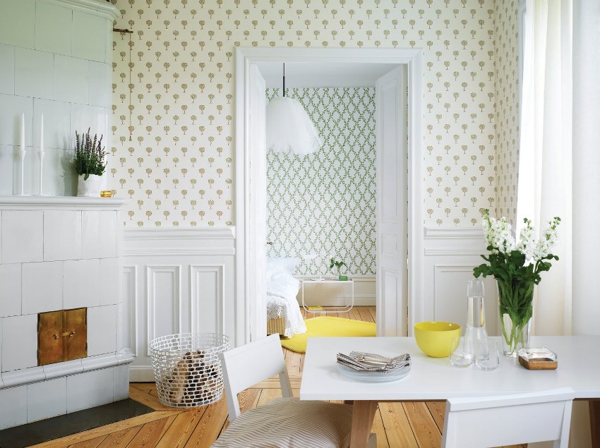 Обои на стенах — очень плотные, бумажные, флизелиновые или тканевые, с цветочными рисунком, вертикальными полосами с орнаментом. Цвета обоев — рисунки с сельской тематикой на светлом фоне.
