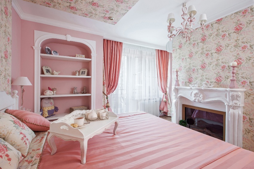 Обязательным элементом является туалетный столик с креслом, а также комоды с выпуклыми ящиками и консоли. В качестве освещения подойдут подвесные люстры и изысканные светильники с тонкими, металлическими элементами. Для отделки можно выбрать штукатурку, краску или обои в цветочный принт.