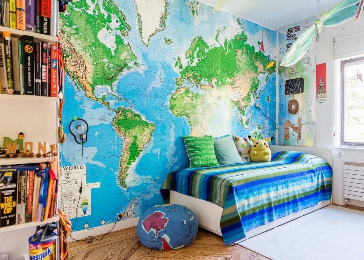 - Подростки – от 12 до 16 лет, здесь выбор во многом зависит от уже сложившихся интересов и хобби. Это может быть как большое фото кумира (спортсмен, артист, музыкант), так и фотообои с географическим наполнением (карта мира), пейзажи, фото городов или просто абстракция.
