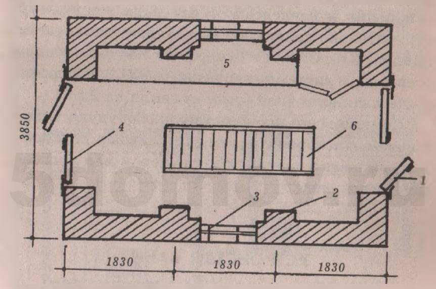 Рис. 2. Гараж с воротами, калиткой и смотровой ямой. План на отметке — 1,5 м (вариант расположения в цокольной части дома; 1 — калитка; 2 — столб кирпичный (для увеличения устойчивости), 3 — окно из стеклоблоков; 4 — ворота; 5 —верстак; 6 — смотровая яма