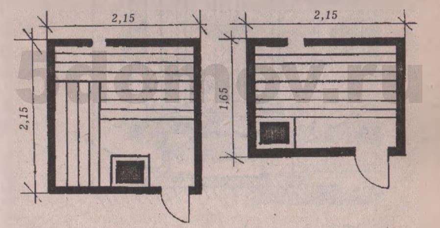 Баня-сауна может иметь следующие габариты: 215 х 215 мм — на 5-6 человек, 215 x 165 мм — на 3-4 человека и 165 x 115 мм — на 1-2 человека. Высоту помещения от пола до потолка принимают равной 2~2,3 м (рис. 3.1 и 3.2.).