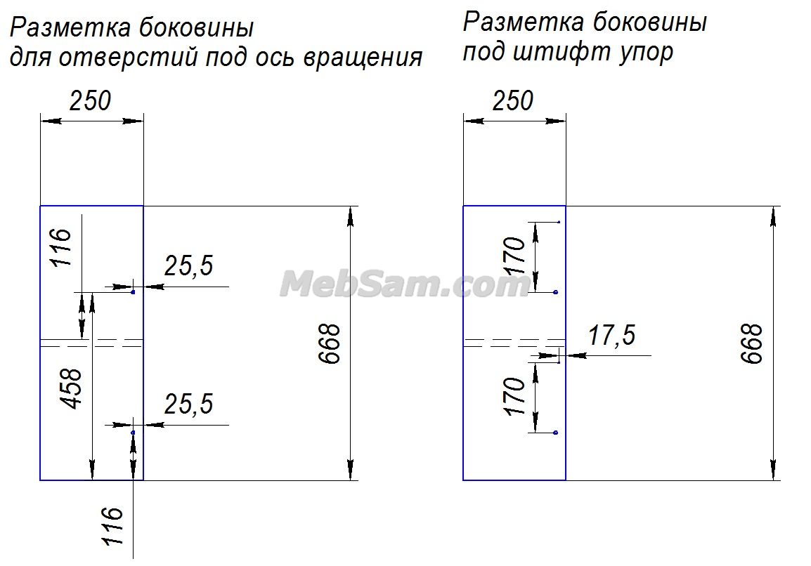 Теперь нам нужно будет установить механизмы для обувницы. Крепятся они на боковины. Ниже представлены монтажные размеры и чертежи крепления этих механизмов: