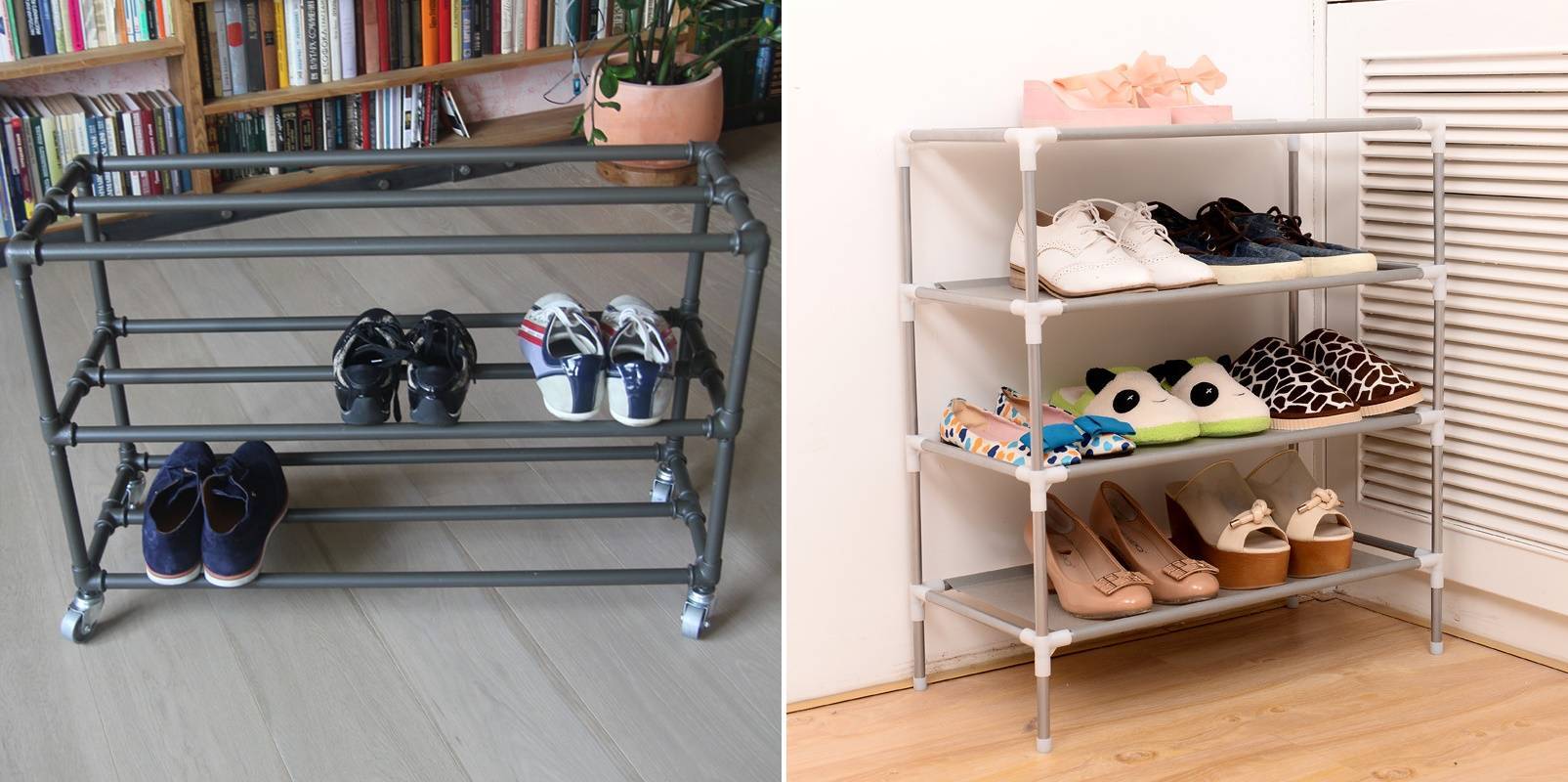 Также можно использовать пластик. Обыкновенные водопроводные трубы, спаянные под правильным углом, послужат вам долгое время в качестве места для хранения обуви.