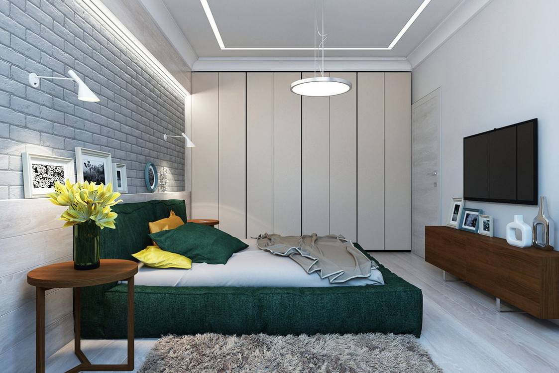Декор: стеновые панели, напольные зеркала, изголовье из кожи или ткани, яркие ткани однотонной расцветки.