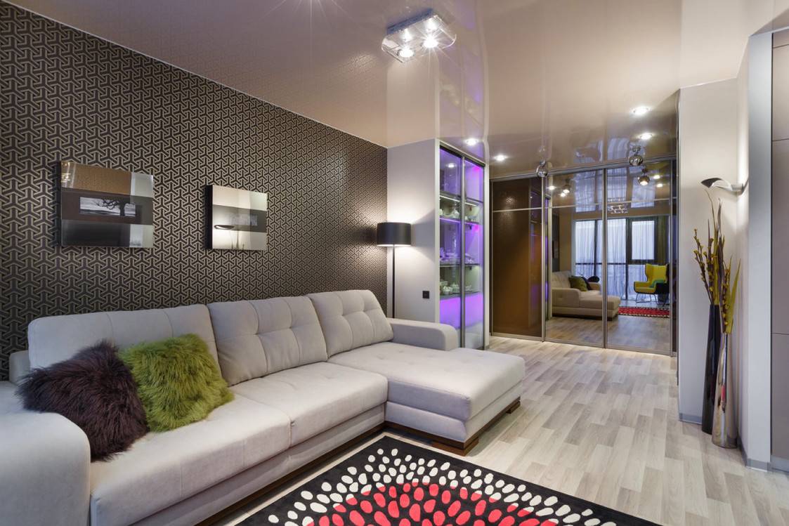 - потолок – глянцевые или зеркальные навесные конструкции.