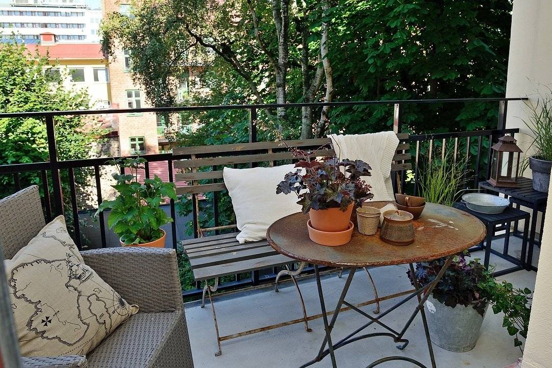 Для балкона в стиле кантри («деревенский шик») используйте деревянную или плетеную мебель. В качестве горшков для растений можно задействовать небольшие бедра из металла. На стены повесьте имитацию уличных фонарей. Все должно быть оформлено просто, но с душой.