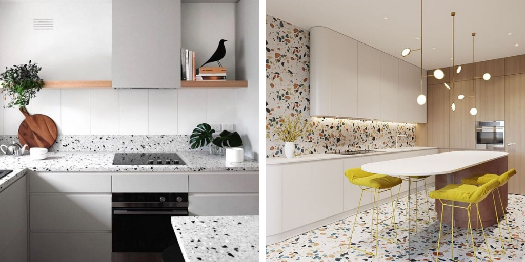 Сочетание мелких частиц различных камней на нейтральном фоне выглядит органично в кухонном интерьере. Сочетание нейтральных оттенков с яркими акцентами отлично подходит для помещения, выполненного в минималистичном стиле. Терраццо не рекомендуется комбинировать с яркими декоративными элементами.