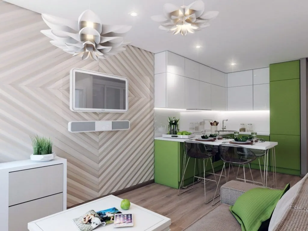 Если в кухне преобладают зеленые цвета — для обеденной зоны подойдут более светлые тона. Зеленый цвет возбуждает аппетит.