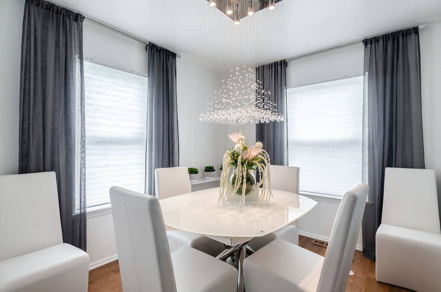 Дополнить дизайн столовой-гостиной лучше всего роскошным светильником с хрустальными подвесками.
