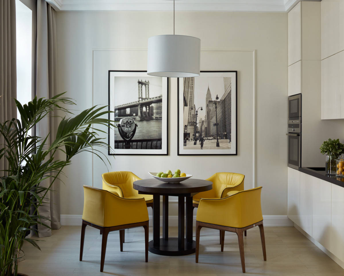 - Используйте «правильный» стол. Правильно подобранный стол занимает меньше места и грамотно вписывается в интерьер. Не забудьте и про стулья. Они должны подходить по дизайну и размеру выбранному столу. Свободное место между рабочей и обеденной зонами должно быть не меньше 0,4 м.