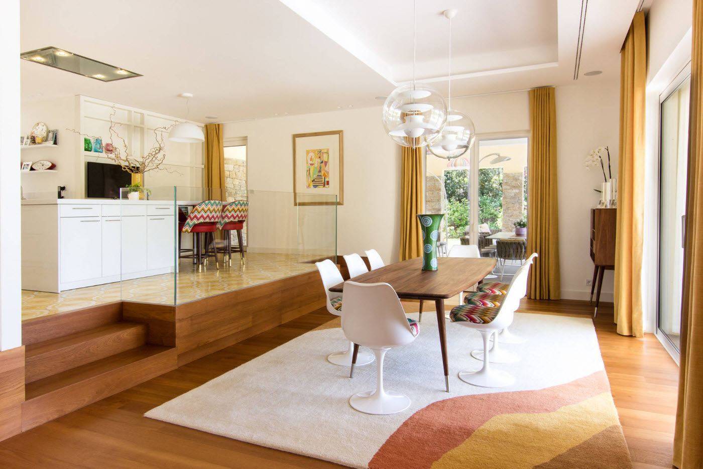 Выделить место, где семья будет принимать пищу, можно по-разному. Чаще всего это делают, меняя цвет (фактуру) участка стены или пола. Дополнительным способом зонирования служит освещение.