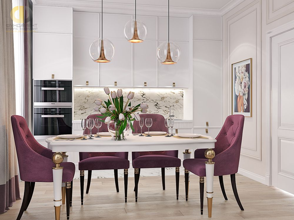 Такое помещение обычно бывает в элитных квартирах или частных домах. Если ваша цель создание статусного оформления, то можете выбрать Неоклассический дизайн столовой 2021.
