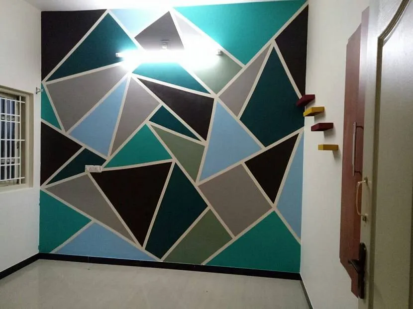 Окрашивание стен часто выполняют в нескольких цветах. Обычно используют два близких оттенка, но применяются и абстрактные мотивы. Ломаные линии вдоль стены создают иллюзию объема.