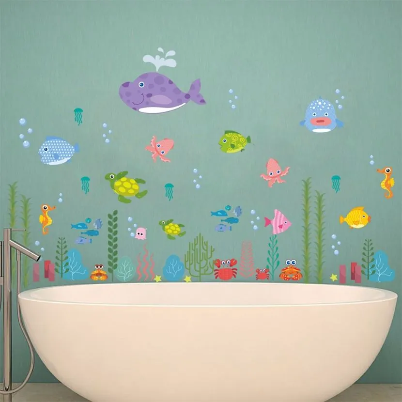 Оформление ванной требует внимания. Недостаточно просто покрасить стены в помещении. Их можно разнообразить морскими обитателями и водорослями. Если нет возможности выполнить рисунок самостоятельно, воспользуйтесь картонными шаблонами. Эскизы целесообразно создавать в зоне раковины или ванной. Допустимо также на боковой стене возле унитаза.