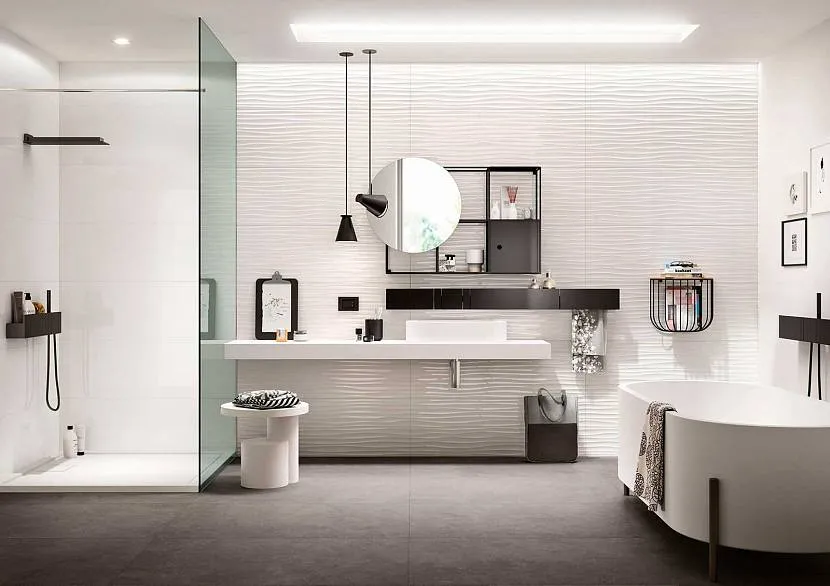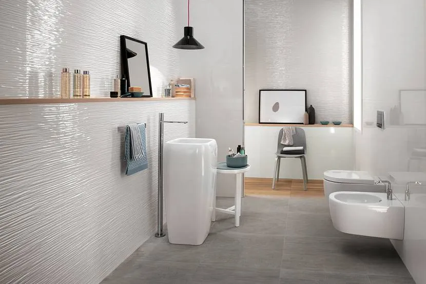 Белая фактурная и глянцевая поверхности ванной Источник design-homes.ru