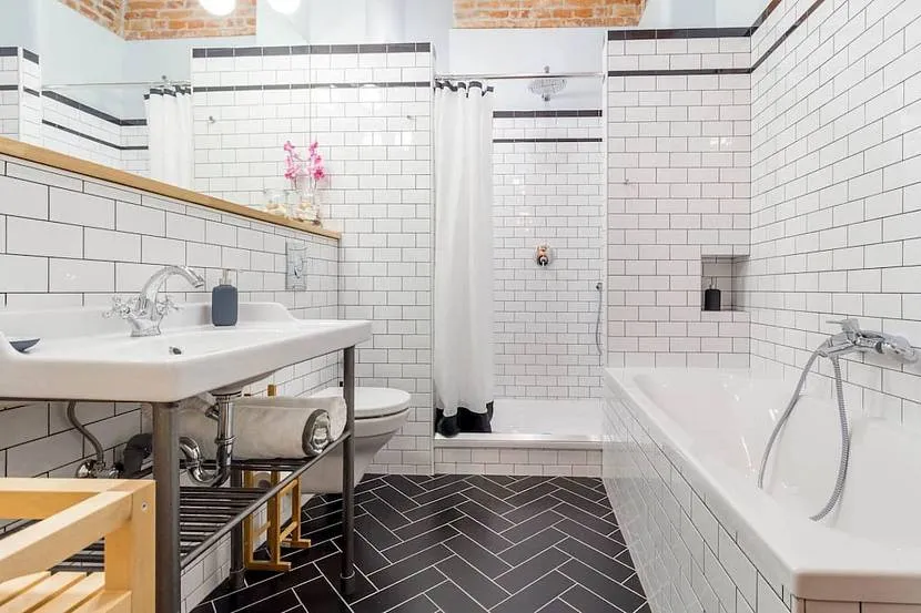 Характерная черта стиля лофт — наличие кирпичной стенки или её имитации. Такой эффект создается в рабочей зоне: возле раковины или ванной. Принято стенку возле функциональных объектов: унитаза, емкости для купания, раковины облицовывать кафельной плиткой-кабанчик. Ее монтируют горизонтально, имитируя кирпичную кладку.