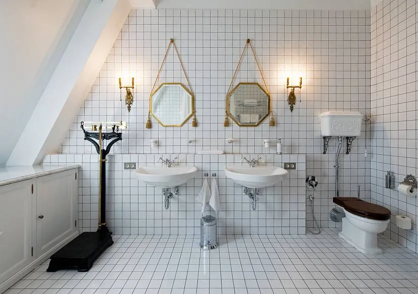 Унитаз, биде, ванная являются акцентами в помещении, они изготовлены в белом цвете. Вокруг этих объектов приветствуется наличие декорирования: изящные корпусы для туалетной бумаги, фигурные подставки для зубных щёток, держатели для губок и мочалок.