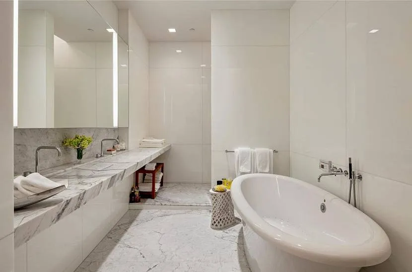 Если вы хотите получить не просто ванну в сером тоне, а роскошный дизайн, используйте натуральную мраморную плитку или кафель с имитацией мрамора, как на представленном ниже фото:
