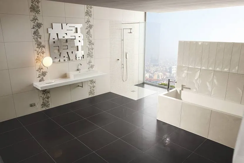 Белая плитка в ванной может быть изготовлена из различных составляющих. Из этого складывается её стоимость, внешний вид и ещё ряд некоторых нюансов. Если вести классификацию по этим признакам, кроме классического кафеля и керамогранита, следует назвать стеклянную и виниловую.