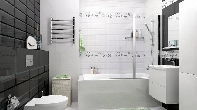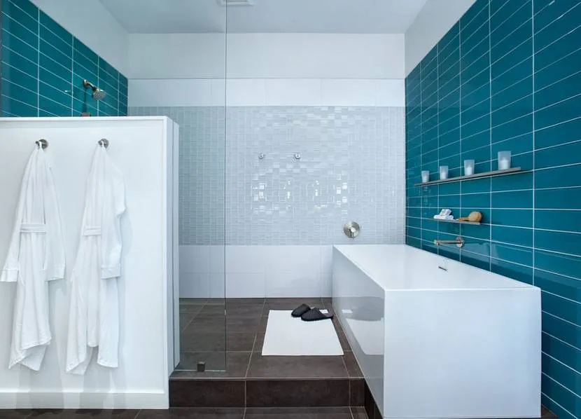 Можно использовать и темные, но только фрагментами — выложить полосу (вертикальную или горизонтальную), часть стены или даже одну стену, но точно не все помещение. В оформлении ванной плиткой также как и при поклейке обоев, практикуют комбинирование нескольких «дружественных» или контрастных цветов.