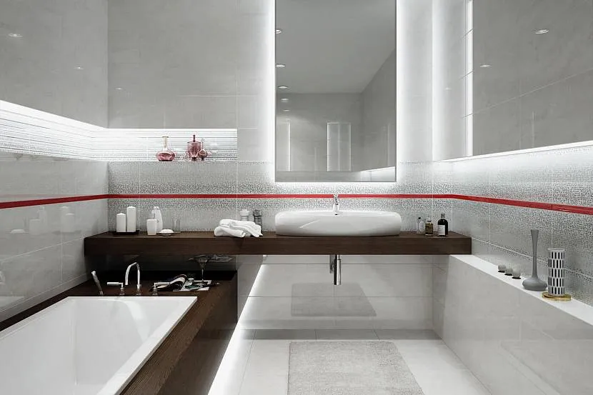 Для того, чтобы визуально расширить пространство и сделать дизайн интереснее, к большой кафельной плитке стандартных размеров добавляют в виде полос мозаику. Особенно хорошо в виде отделки смотрится керамическая мозаика в нишах, в качестве облицовки ванны или умывальника. Такое комбинирование делает интерьер более выигрышным.