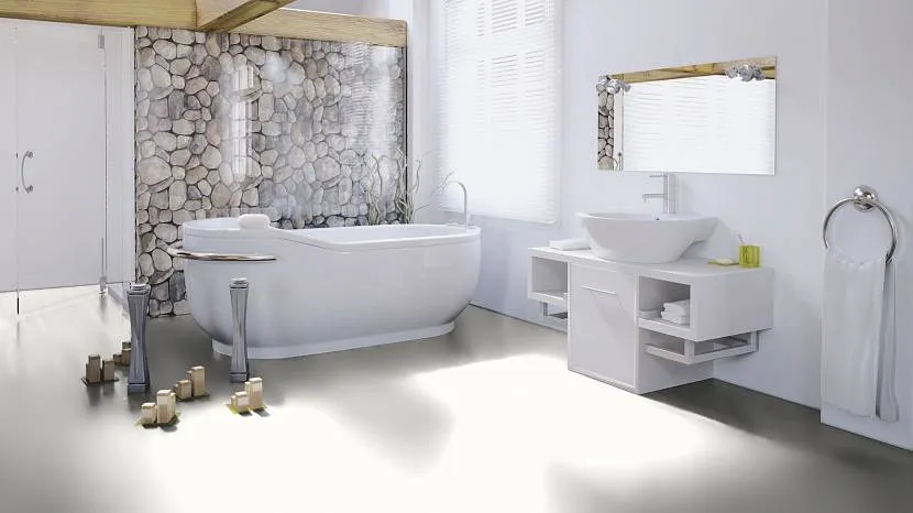Гибкая виниловая плитка в интерьере ваннойИсточник cloudfront.net