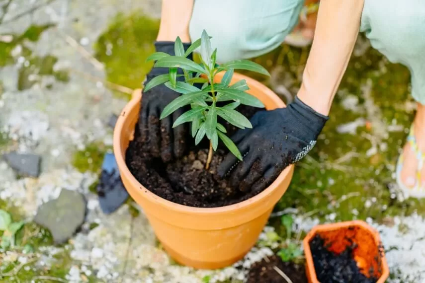 Олеандр не требователен к почве и может расти в различных типах землесмеси. Оптимально сажать кустарник в грунт с хорошей дренажной способностью и нейтральной или слабокислой реакцией (pH 6.5-7.5). Для пересадки лучше всего подходит легкая песчаная почва с добавлением компоста или перегноя для повышения плодородия