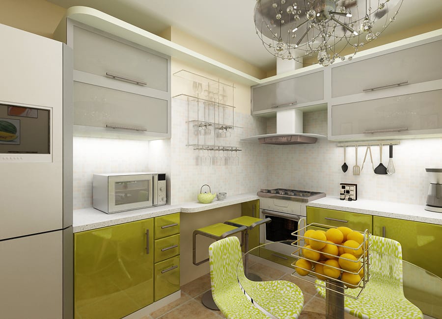 Пастельные оливковые оттенки и солнечный лайм очень актуальны и часто применяемы в современных дизайн-проектах. Здесь преобладает глянцевая мебель и отсутствует лишний декор. Обычно используют простой гарнитур без сложных геометрических фасадов. Цвет лайма применяют для оформления стен, фартука, а также для штор, кухонной утвари, предметов мебели.