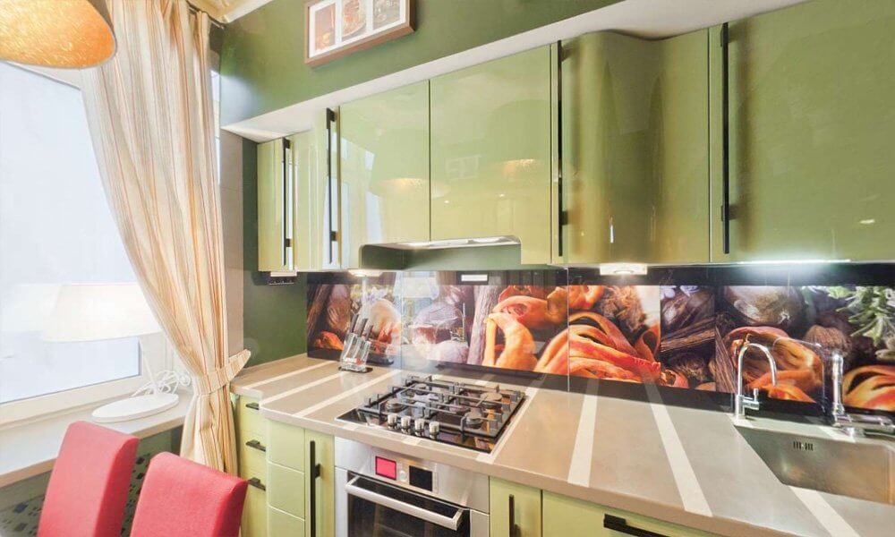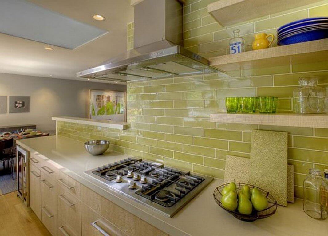 Кухонный фартук лучше выполнить из керамики. В интерьер гармонично впишется мозаика цвета оливы с серым или черным оттенком. Удачным решением станет использование закаленного стекла. Эту часть стены украсят нарисованные на плитке веточки оливы. Стильно выглядит желтовато-зеленый фартук на фоне рабочей поверхности из светлого камня.