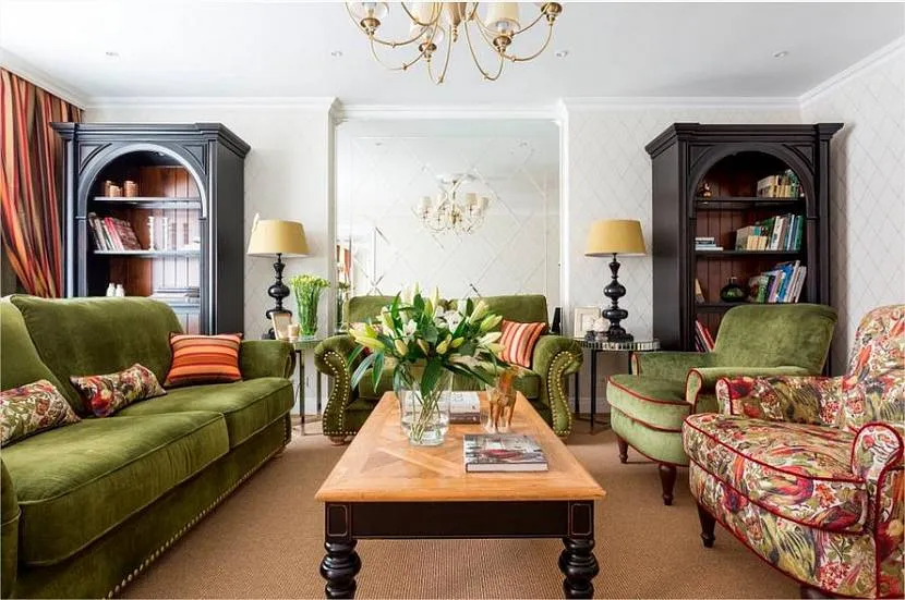 Английский стиль знаменит строгостью, элегантностью, роскошью, качеством материалов. Оливковый цвет в интерьере жилища также обладает этими качествами, он способен подчеркнуть и выделить важные зоны в помещении.