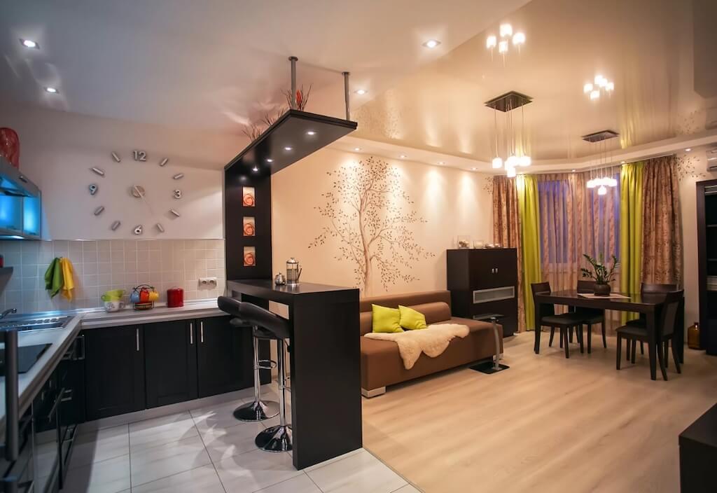 При разделении кухни и зоны отдыха барная конструкция является отдельно стоящим предметом интерьера (конечно, возможны варианты), добавляя оригинальности в интерьер. Её также можно использовать для быстрых перекусов, когда нет необходимости накрывать стол на несколько человек.