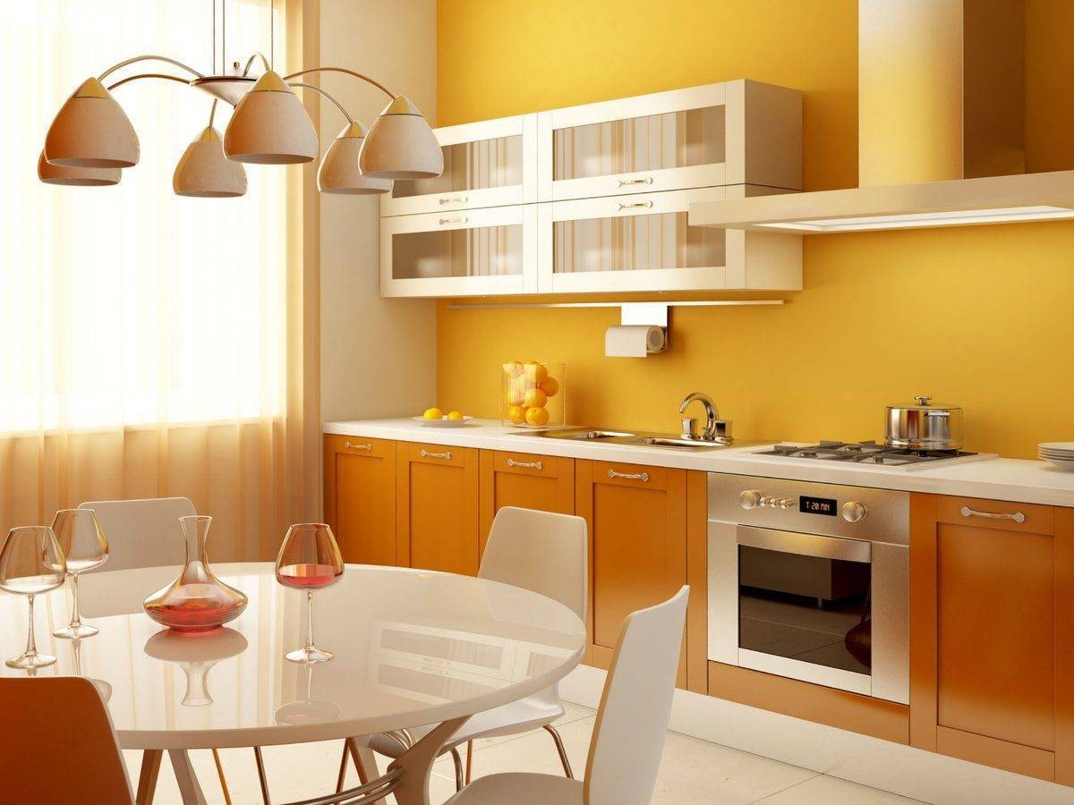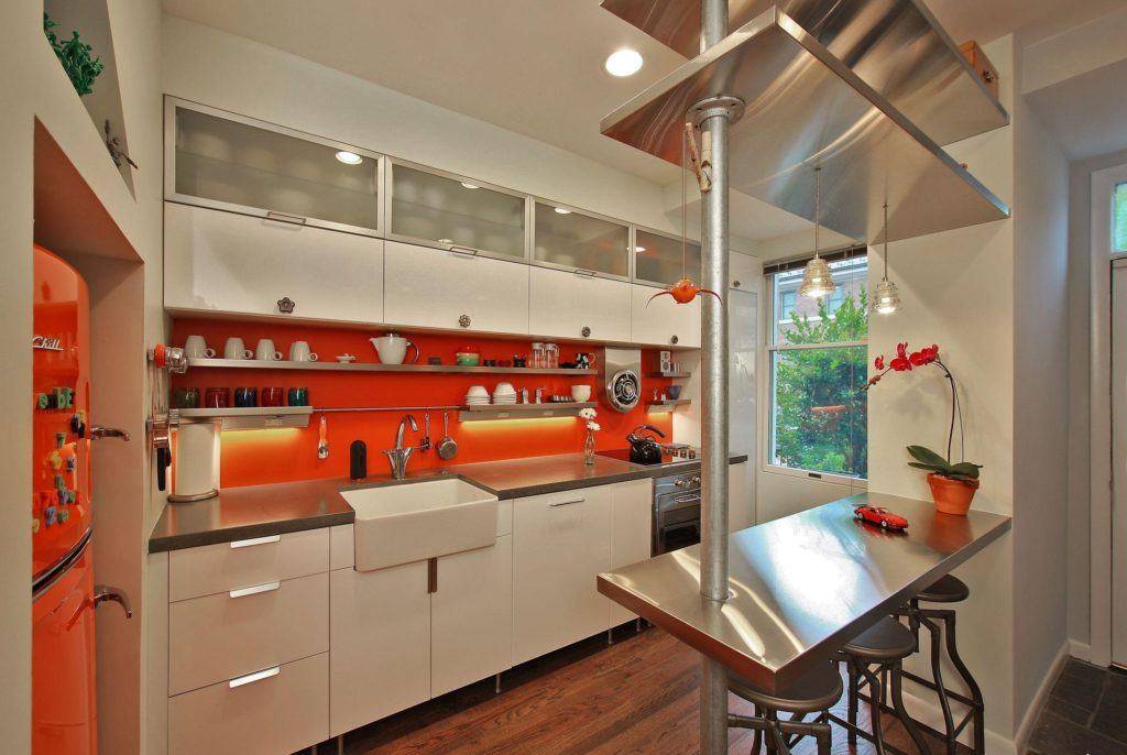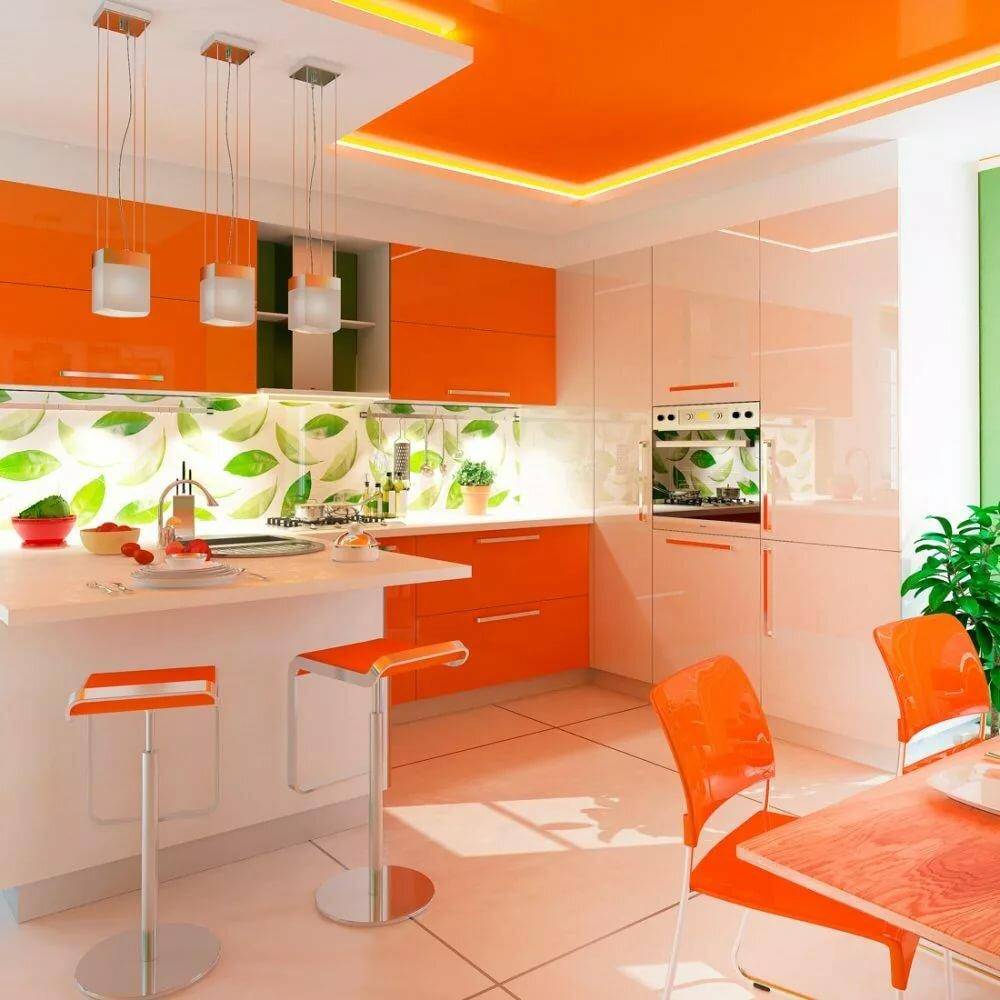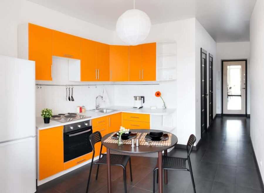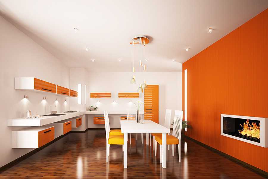 Идеальный способ обустройства интерьера — совместить белые стены с оранжевым гарнитуром. Пол на кухне может быть бежевым. Прекрасно смотрится также одна оранжевая стена в сочетании с тремя совершенно белыми.