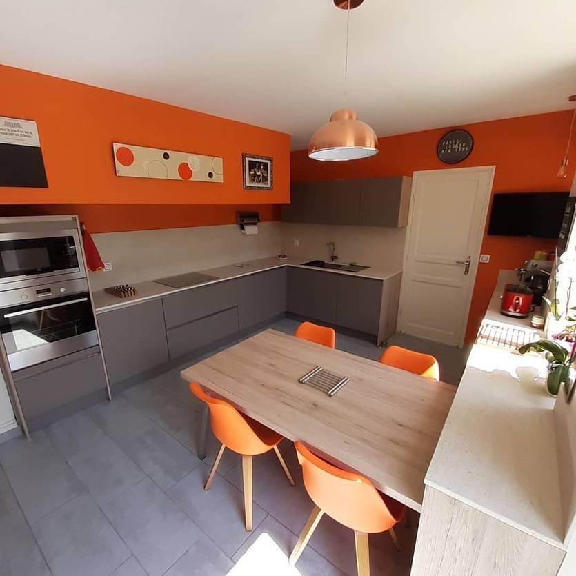 Распространенное сочетание. Оранжевый цвет кухни приглушается и серый полноценно раскрывается. Красивое сочетание в интерьере, придающее кухне элегантность, сдержанность. Например, серый верх яркий низ.