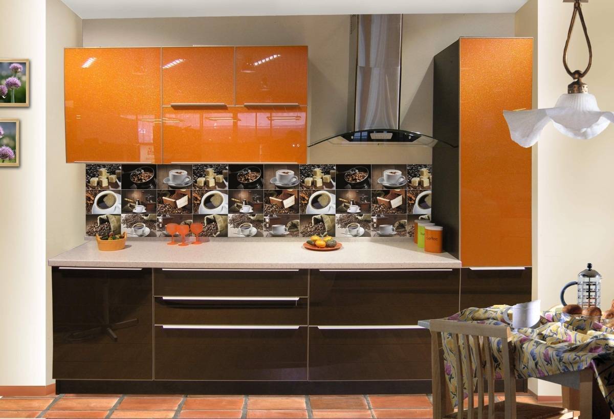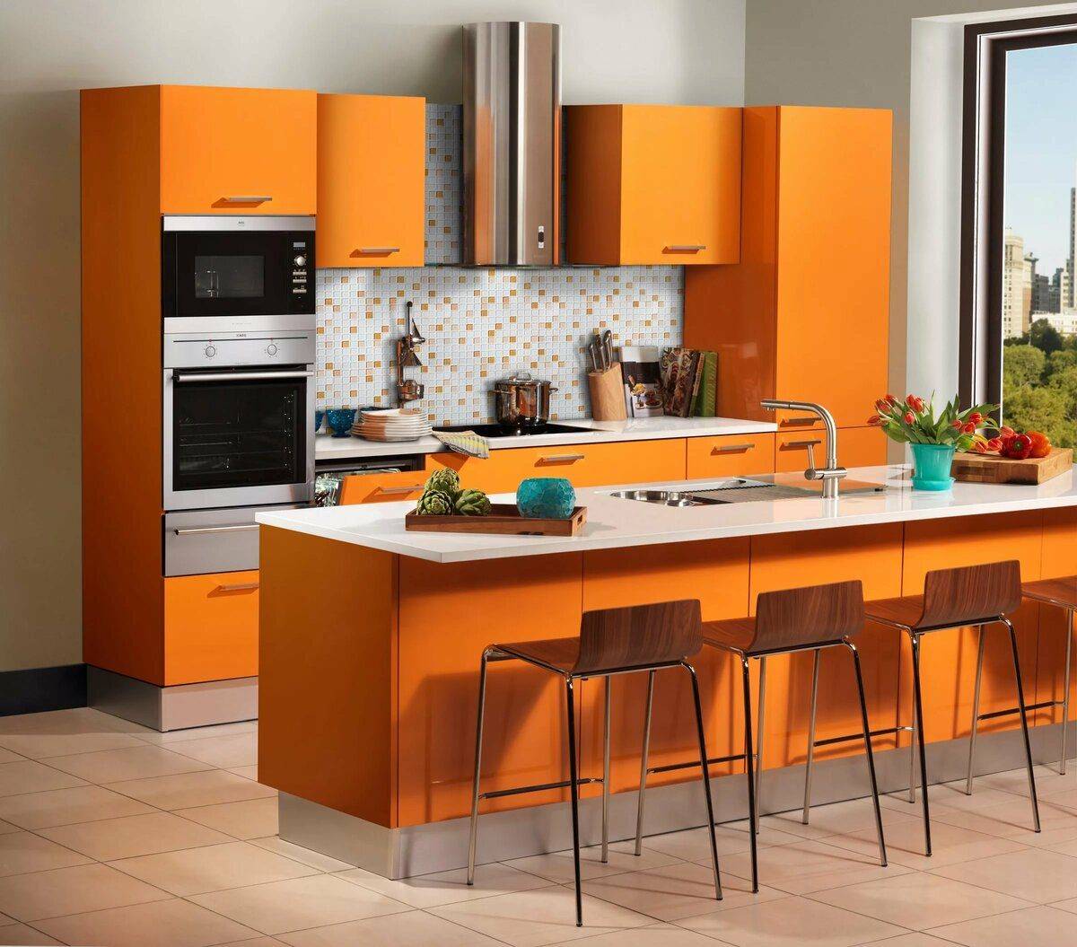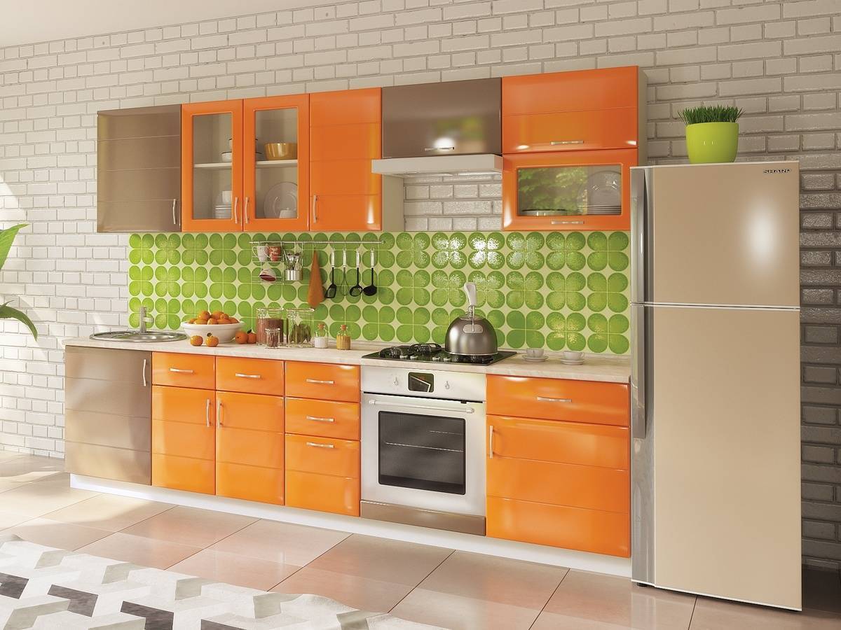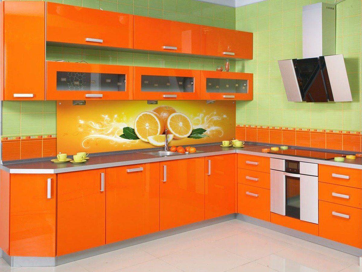 Кухонный гарнитур оранжевого цвета с ярким фартуком
