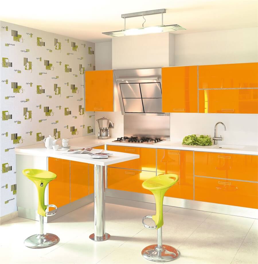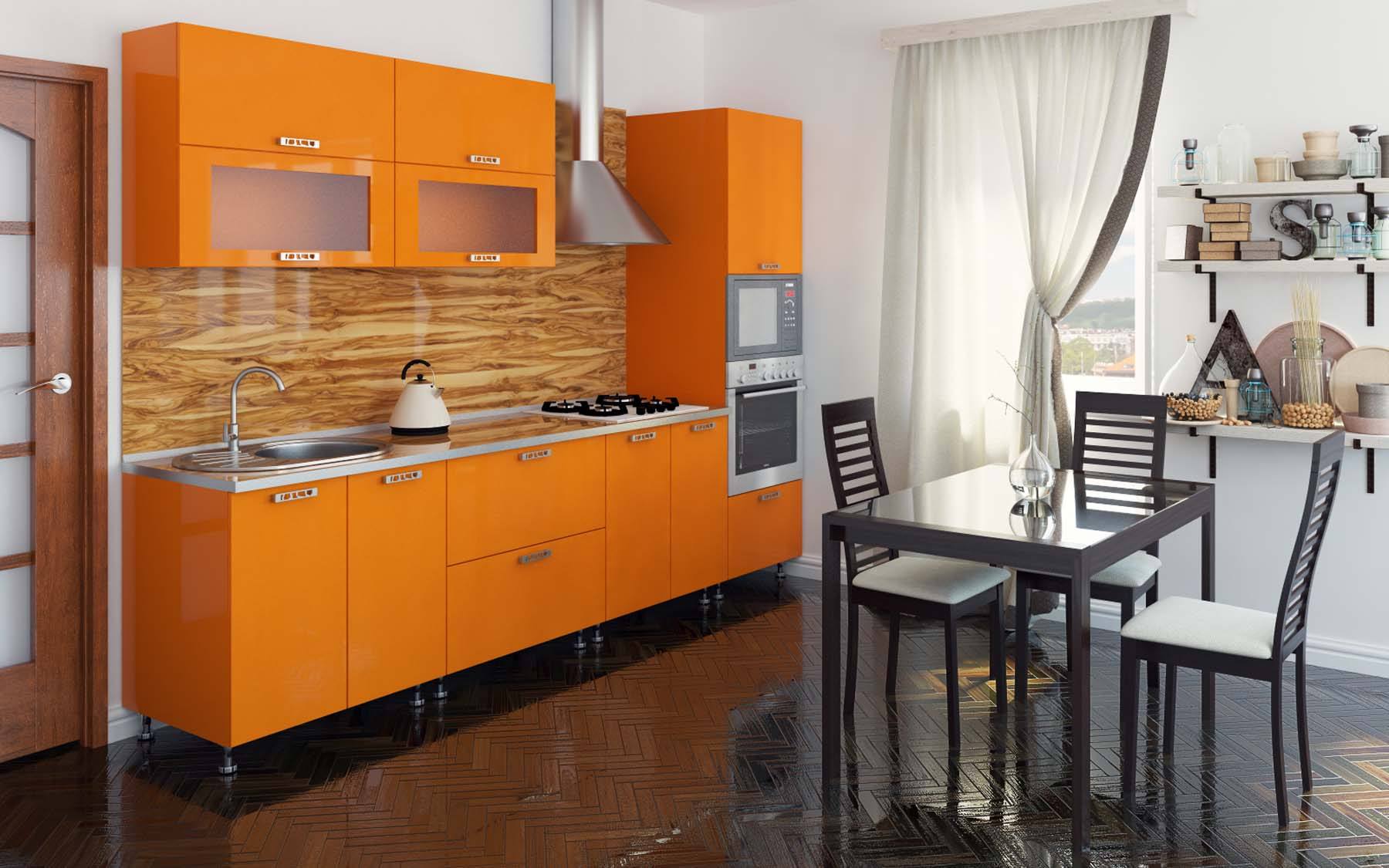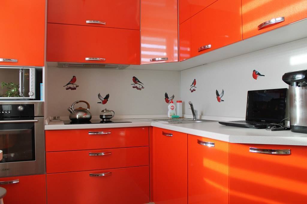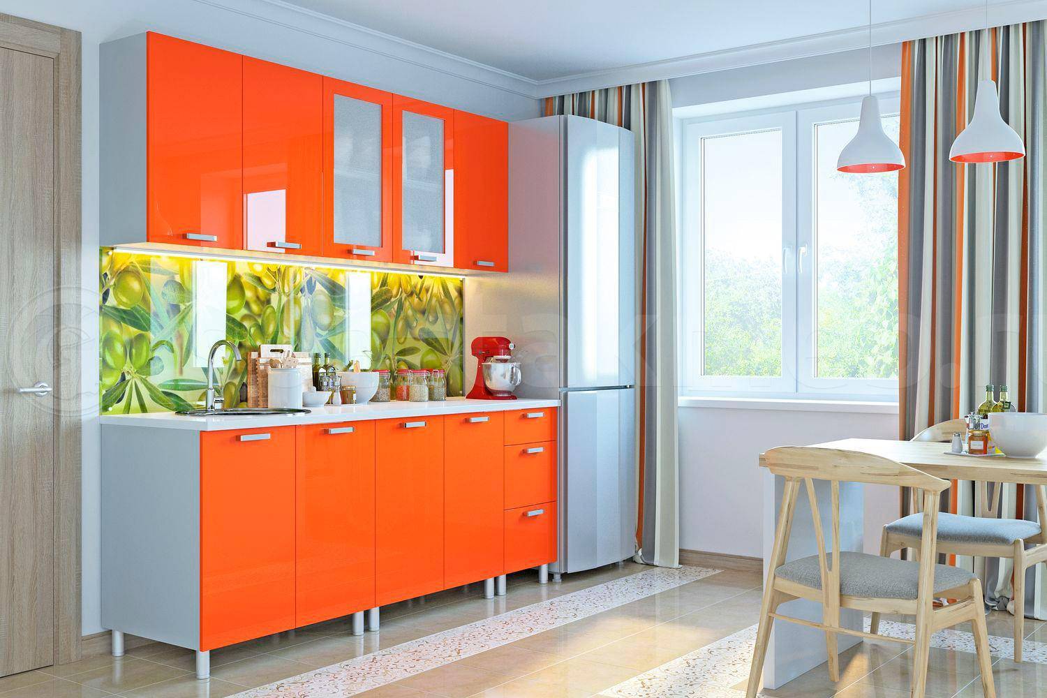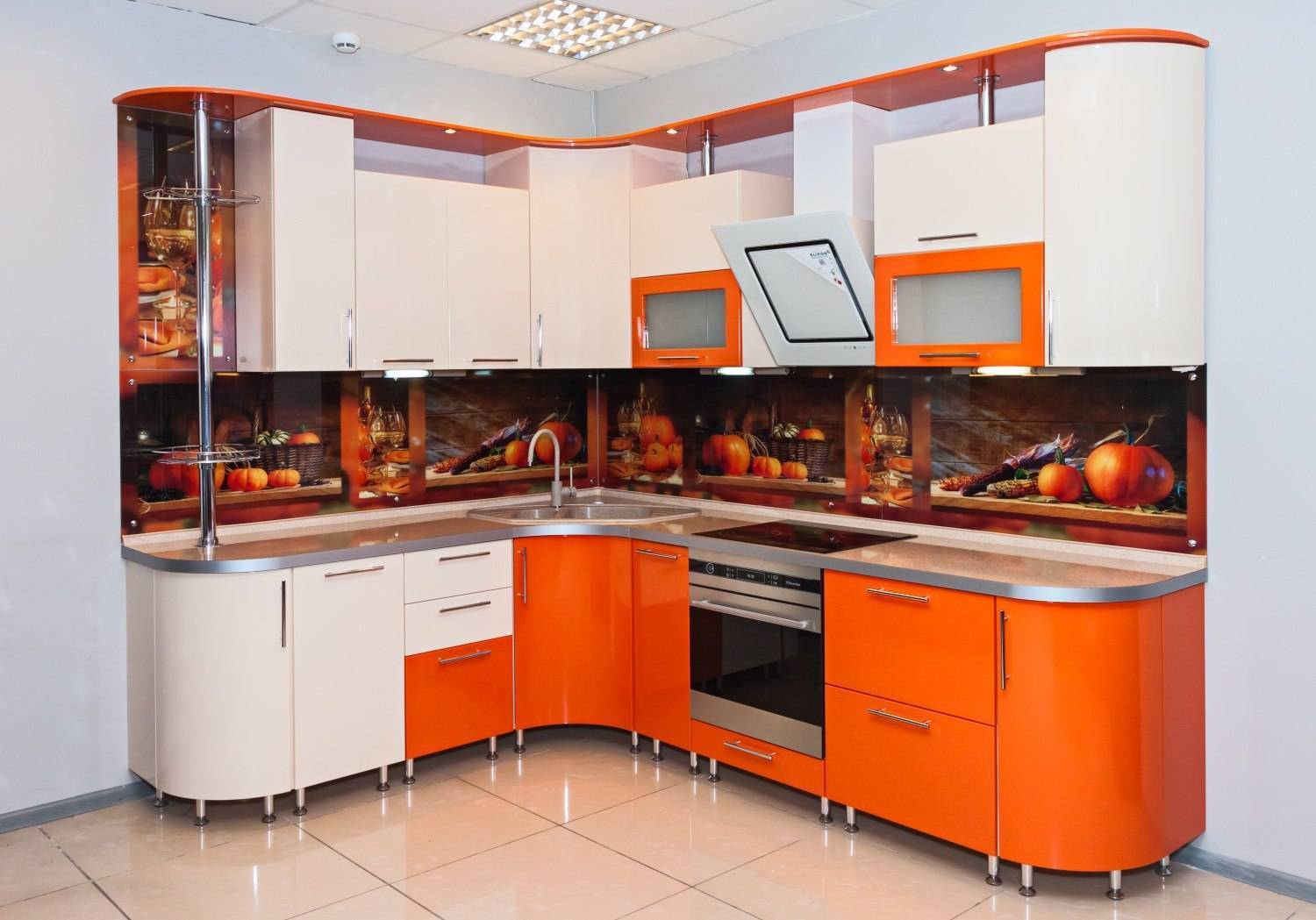 Кухонный гарнитур оранжевого цвета с ярким фартуком