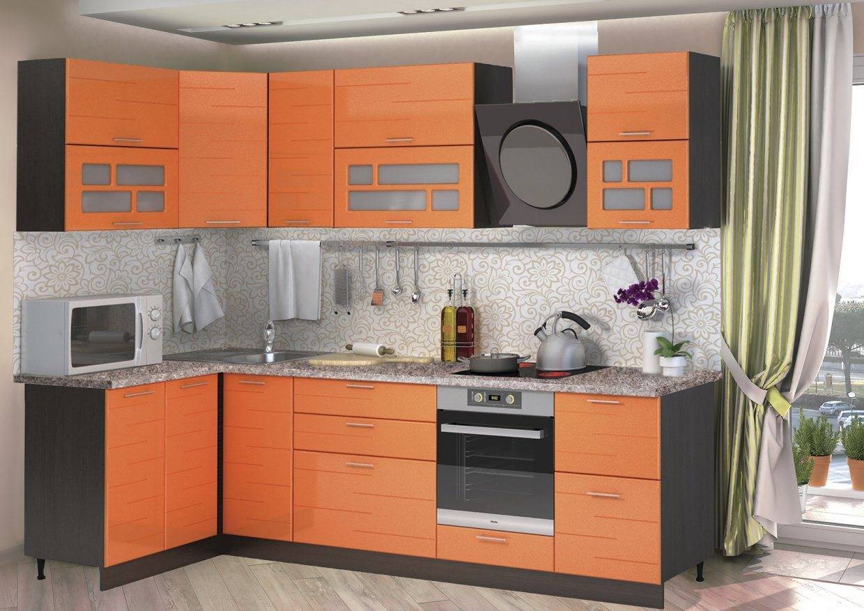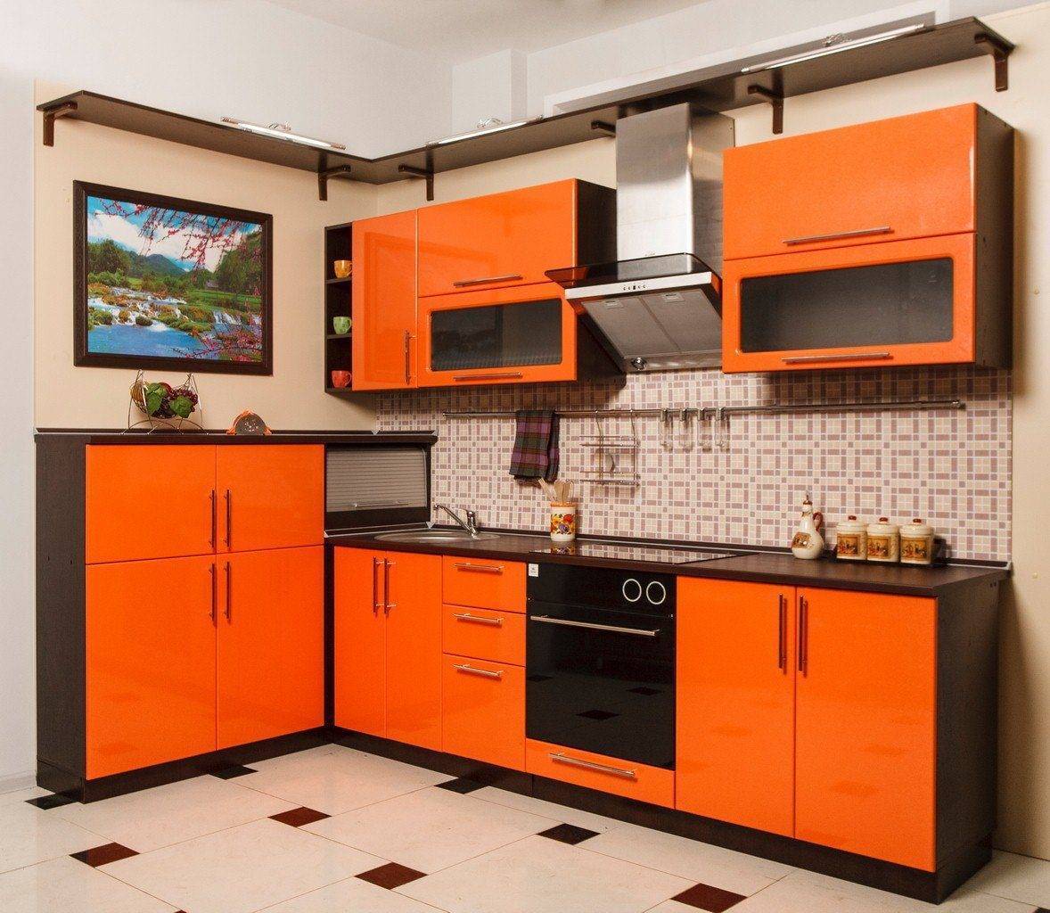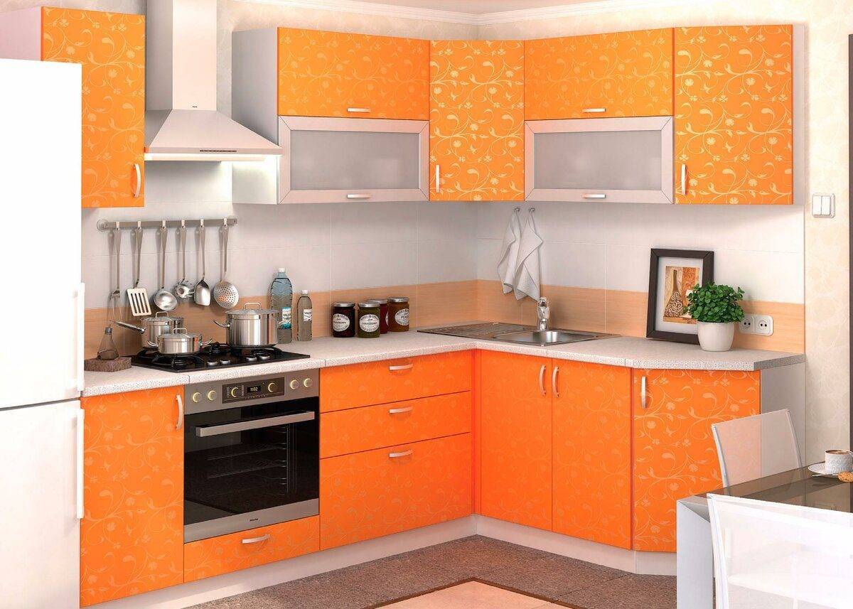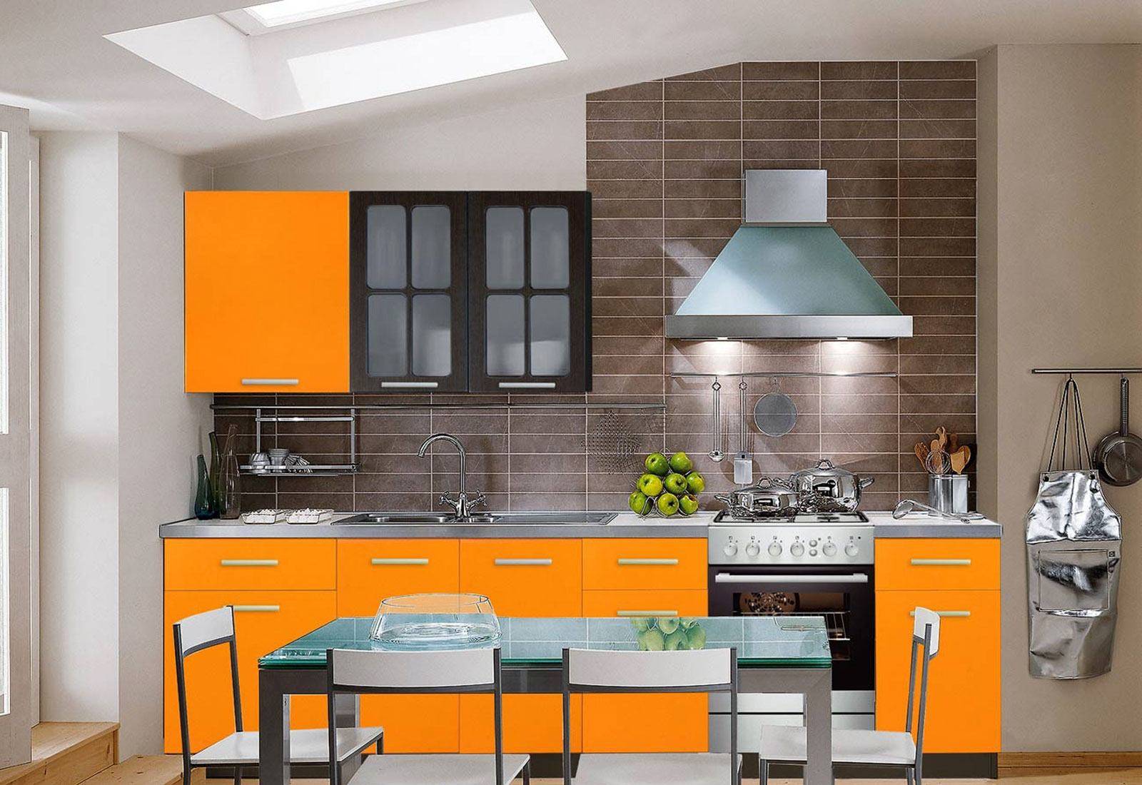Кухонный гарнитур оранжевого цвета с ярким фартуком